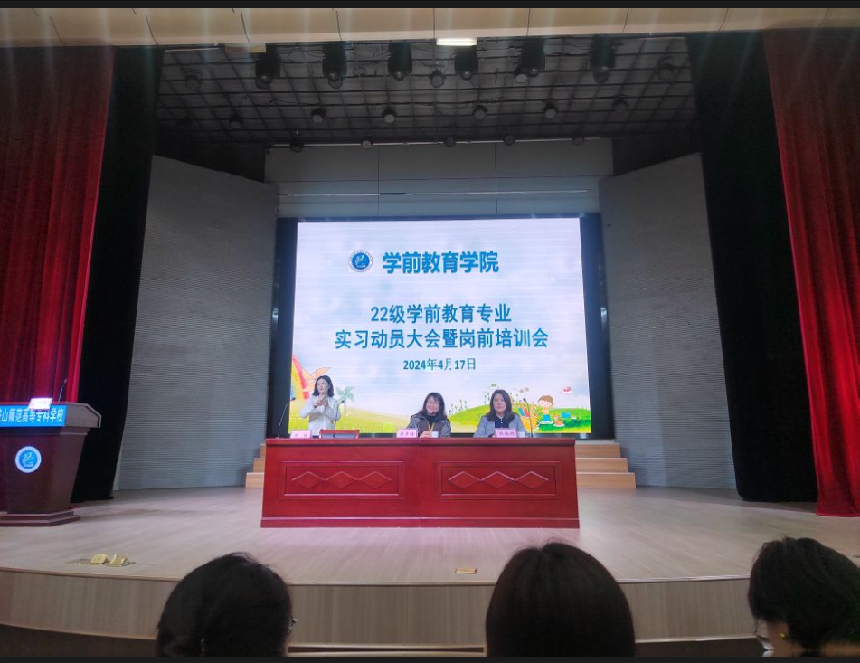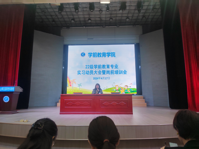 4月17日下午,学前教育学院在校音乐厅举办了2022级学前教育专业学生中期实习动员会暨岗前培训活动。统战部副部长王方、艺术设计学院党总支书记吴德琴、学前教育学院副院长黄夕梅、珍珠园幼儿园园长孔海娟及本次实习班级辅导员、实习带队指导老师、全体实习生参会。