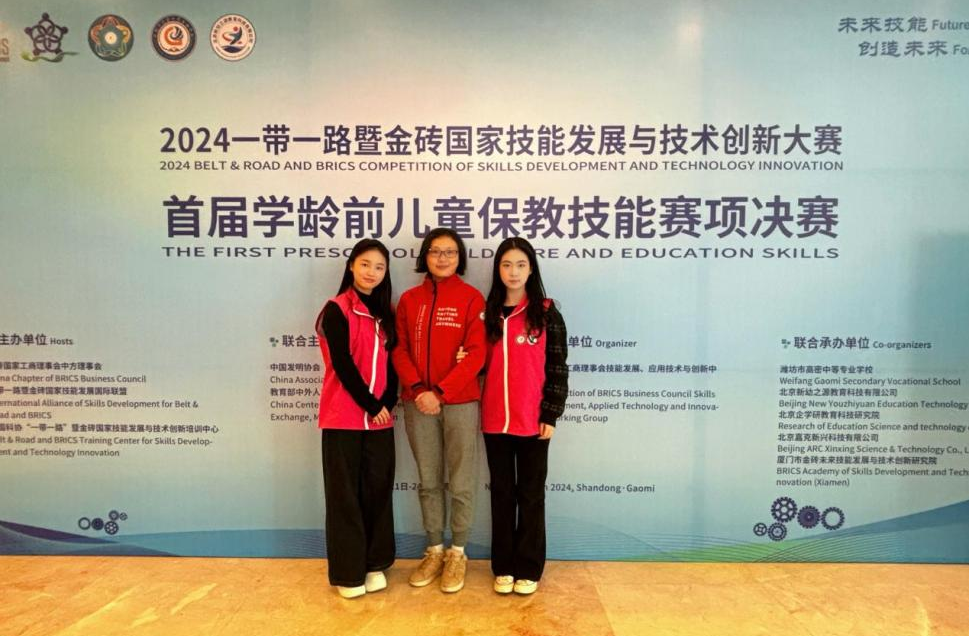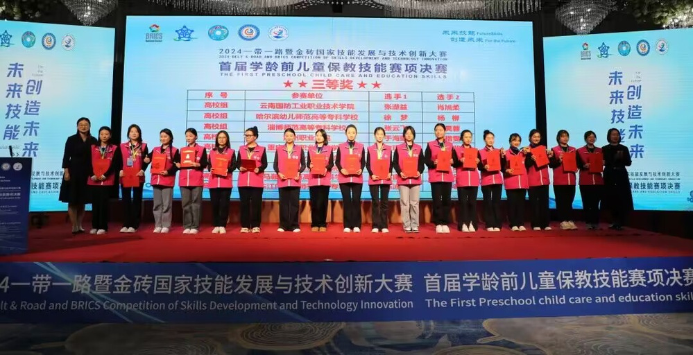 近日,由金砖国家工商理事会中方理事会、一带一路暨金砖国家技能发展国际联盟、中国科协“一带一路”暨金砖国家技能发展与技术创新培训中心主办,中国发明协会、教育部中外人文交流中心联合主办的2024一带一路暨金砖国家技能发展与技术创新大赛首届学龄前儿童保教技能赛项决赛在山东高密举行并圆满落幕。此次首届学龄前儿童保教技能赛项决赛设有中职组、高校组和教师组三个类别,其中高校组吸引了全国65所高校、130名选手参与竞技,我院2022级学前教育(1)班吴宙涵同学和(6)班伍雨欣同学在比赛中表现出色,获高校组三等奖。