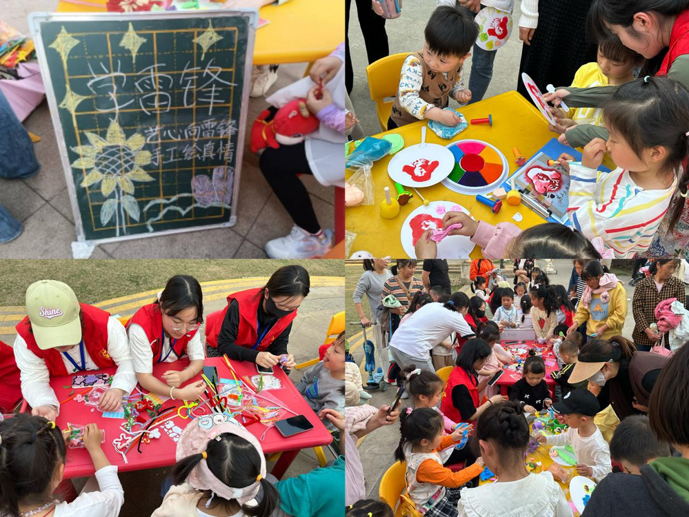 活动现场,学前教育学院志愿者们充分发挥专业特长,精心准备了丰富多样的手工材料,与社区儿童及居民共同创作。从海绵拓印的雷锋扇,到彩纸折叠的花朵,从黏土捏制的小动物,到创意十足的环保手工,每一个作品都饱含着大家的巧思与热情。志愿者们耐心地指导小朋友们使用工具,鼓励他们大胆发挥想象力,现场气氛热烈而温馨。
