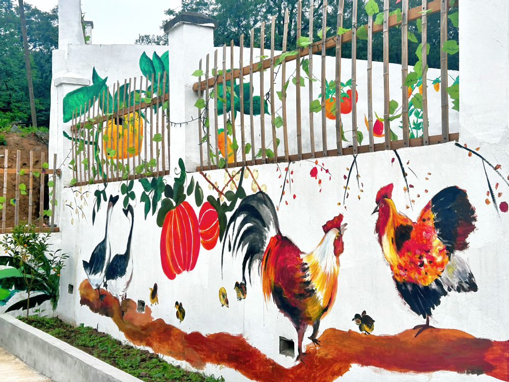 活动中,志愿者们以“党建引领乡村振兴”为主题,结合万元村的自然风貌和文化特色,精心设计了多幅墙绘作品。丹青坊美术社的同学们用细腻的笔触描绘出鸡笼山的秀丽风光,将动物、竹子、蔬菜瓜果等元素巧妙地融入其中,让整个画面充满了灵动与活力。在绘画过程中,同学们互相交流、互相帮助,现场气氛热烈而融洽。