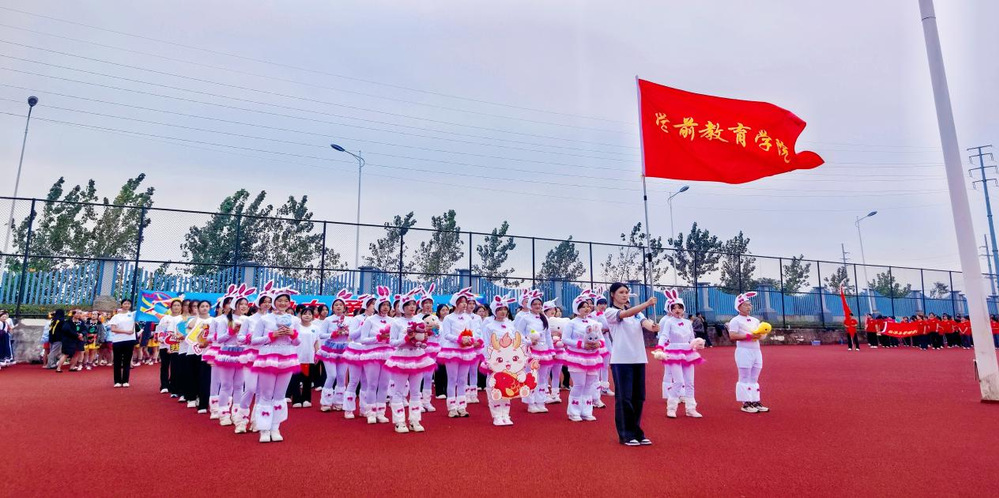 开幕式上,学前教育学院入场方阵惊艳亮相。鲜红的院旗迎风招展,由运动员和学生代表组成的60人的学生方阵迈着朝气蓬勃的步伐走过主席台,将学前学子的灵动与创意铺满田径赛场。