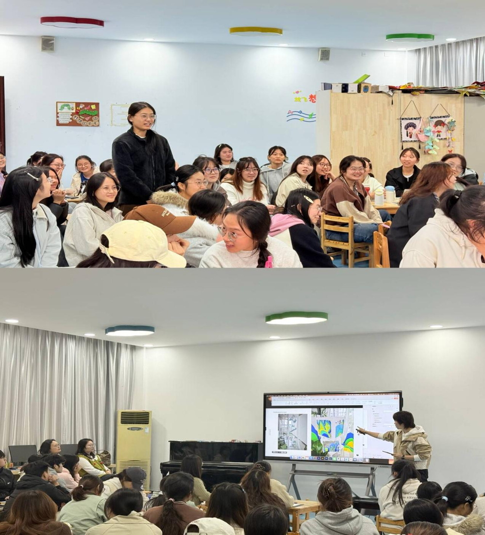 为进一步提升学前教育专业人才培养质量,加强理论与实践的深度融合,我院分别于10月17日和11月6日特邀当涂县姑孰幼儿总园——光明街幼儿园《本土非遗文化融入幼儿园美术园本课程的实践研究》课题组成员唐姝睿老师走进课堂,为师生带来了两场主题为“美术赋能环境创设和班级管理”的实践教学活动。唐老师作为一线骨干教师,结合课题组一年来扎实的研究成果,将幼儿园真实的班级管理案例、环境创设图片视频以及幼儿活动视频等一手资料融入课堂教学。生动鲜活的实践案例,让同学们深入了解了当涂非遗文化与幼儿园美术教育融合的创新做法,为抽象的理论知识注入了生动的实践内涵。