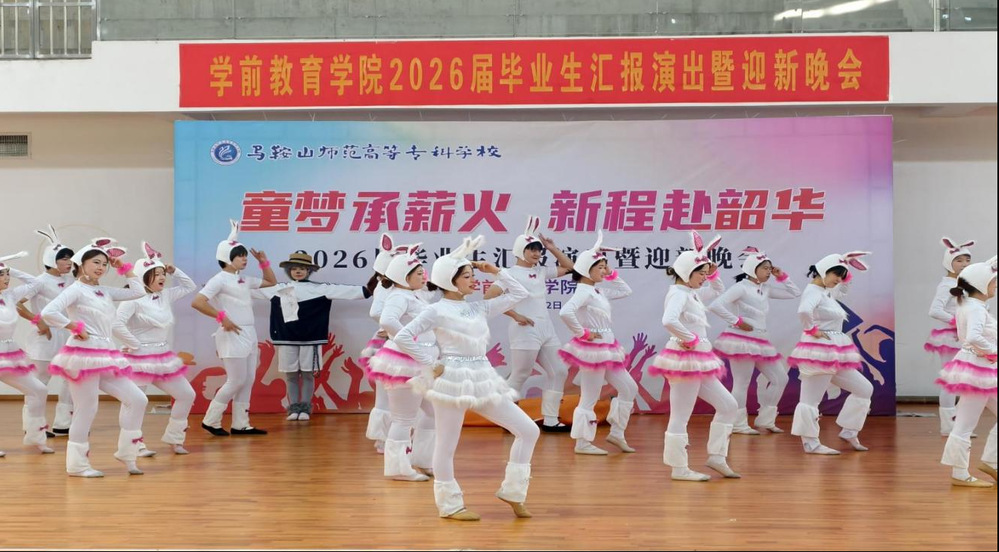 晚会以“童梦承薪火,新程赴韶华”为主题,16个精心编排的节目轮番上演。2021级学前教育五年制8班带来的情景舞蹈《兔气扬眉》拉开晚会序幕,灵动可爱的兔子形象、活力满满的舞姿瞬间点燃全场氛围。