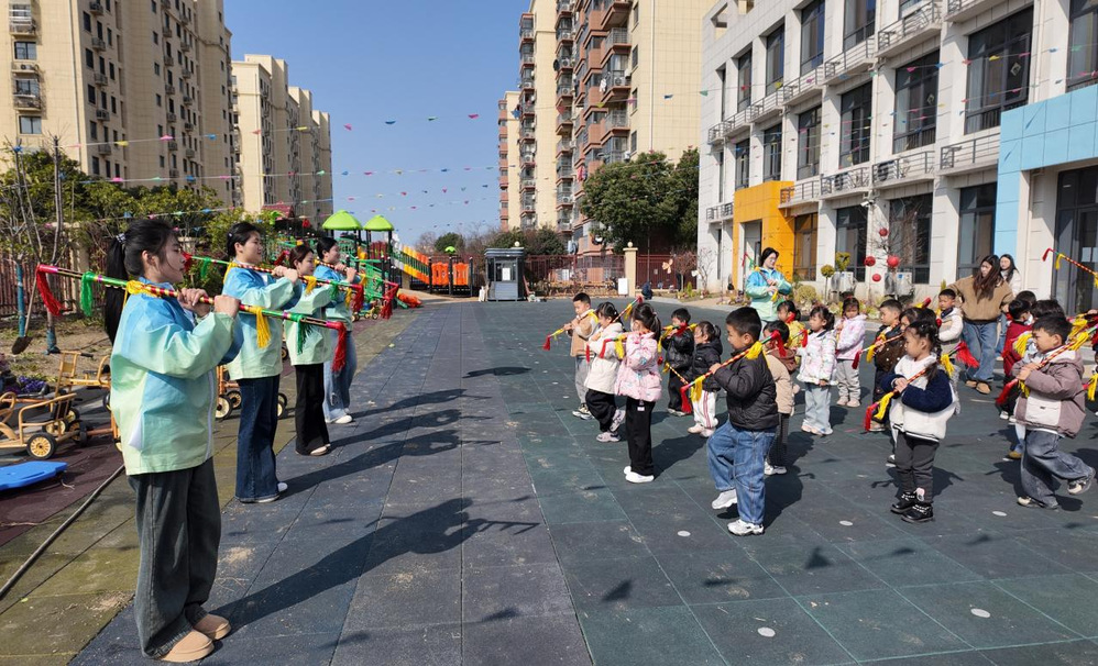 活动以一场充满民俗韵味的打莲湘活动欢乐开启,中班幼儿与志愿者携手参与,在志愿者的耐心指导下,孩子们手持莲湘,跟着明快的节奏抬手、挥臂、跳跃,清脆的竹板碰撞声与欢快的笑声交织在一起,孩子们在沉浸式的互动体验中,感受着传统民俗文化的灵动乐趣,体会着合作相伴的美好。