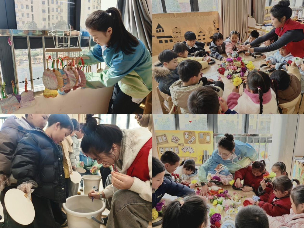 紧接着,全园幼儿分龄开展非遗手工体验,大、中班各有特色。大班幼儿在志愿者指导下体验簪花制作,在梳理花材、搭配造型中感受传统技艺的精巧;中班幼儿在素扇上绘出缤纷创意,让漆扇焕发童真活力。体验活动结束后,孩子们的簪花、漆扇作品被集中展示,小小创作者们自信地站在作品旁,向老师、同伴和志愿者分享自己的创作。